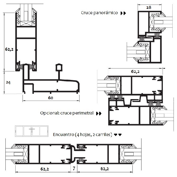 Pertenece a la gama económica y destaca por su alta funcionalidad y estética, gracias a su reducido cruce de tan solo 28 mm. (ver sección). Esta serie se aconseja para ventanas domésticas. Para balconeras, ver serie ALBA PROS 70 (clique aquí). Disponible para 2, 3 y 4 hojas