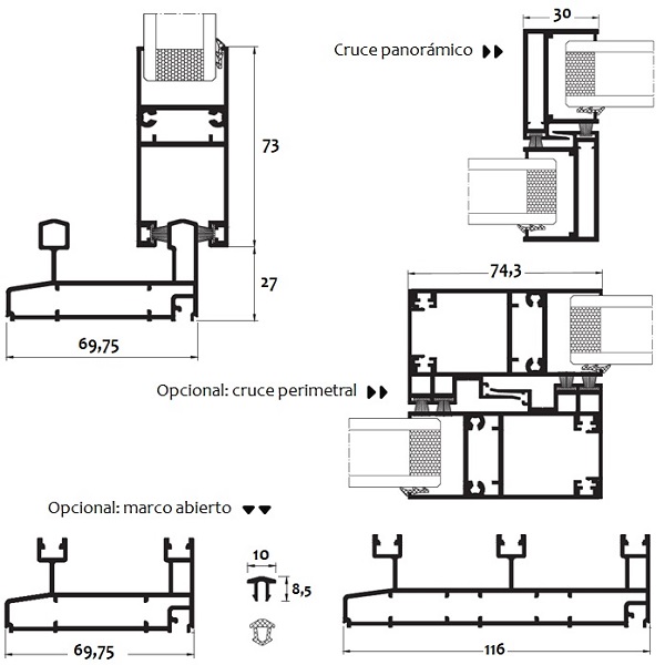 Disponible para 2, 3 i 4 fulles, d' 2 o 3 carriles. Opcional: marc obert (carril inferior intercambiable), encreuament perimetral i tancament multipunt (fins 3 punts).