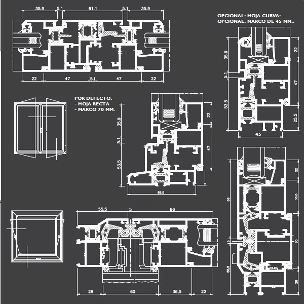 Opcional: hoja curva, hoja sin junquillo, marco de 45 mm. y marco 45×44 mm. (para cerradura).