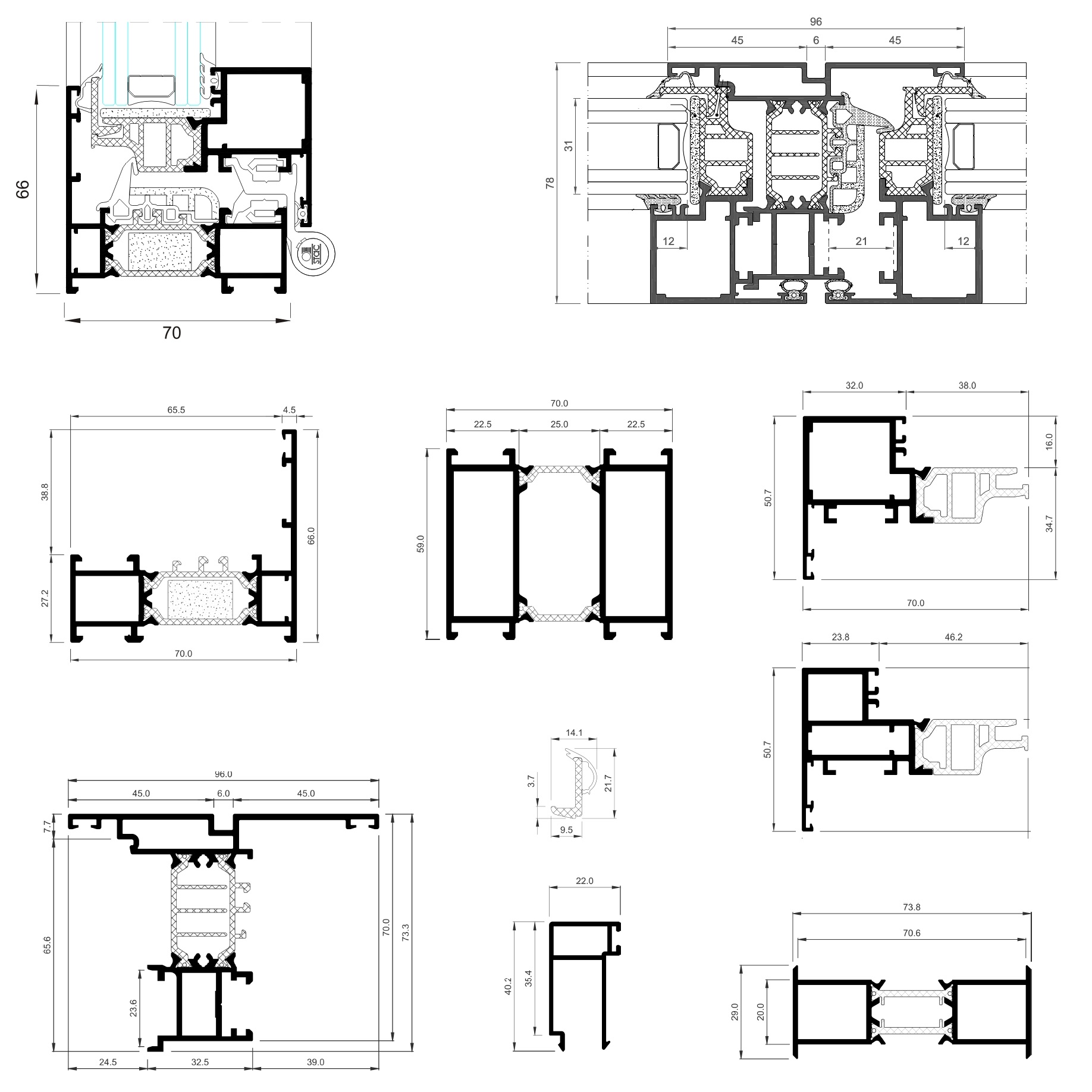 Profundidad del marco y hoja: 70 mm. Longitud poliamida: