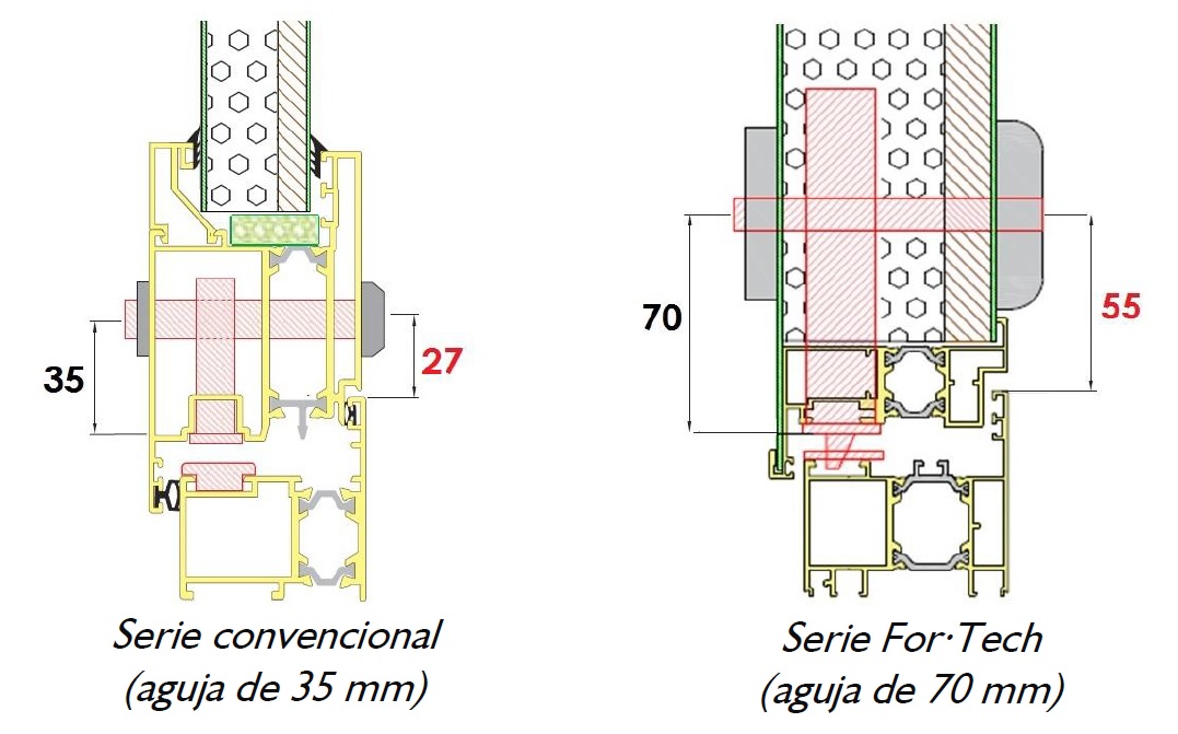 La porta For·Tech d'entrada a habitatge o comunitat d'alta seguretat està dissenyada per acoblar el panell "sense ribets", quedando alineado con el perfil de la hoja y logrando una inmejorable estética. A la part inferior de la porta s'acobla un llindar per evitar entrada d'aire. Cuenta con un panel de 70 mm, compuesto de madera marina de 15 mm i 50 mm de polietilè més planxes d'alumini de 1,5 mm. per cada costat.