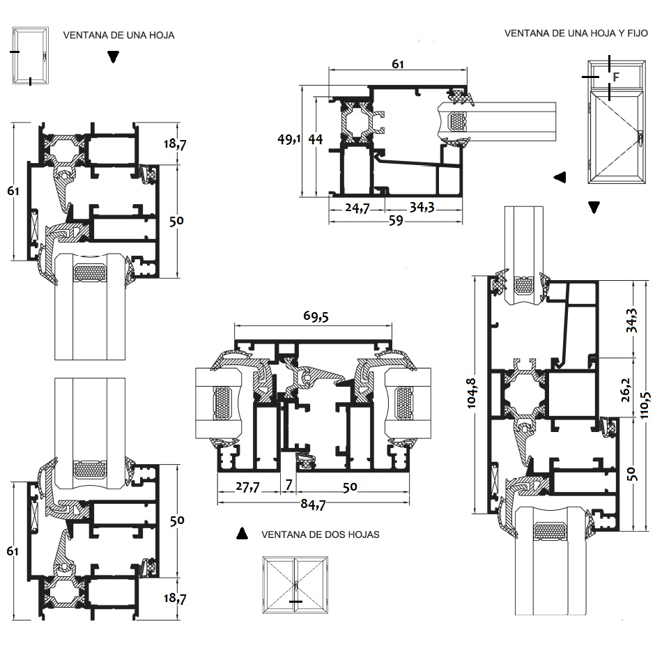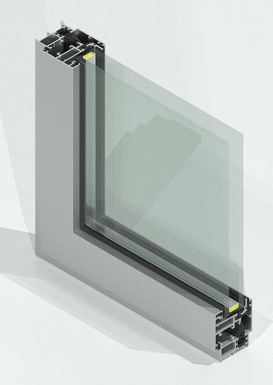 La serie HO 50 R.P.T C.E cuenta con un marco de 50 mm. de profundidad y se caracteriza por su estética moderna y minimalista, propia de los sistemas de hoja oculta, con una sección vista exterior de tan solo 61 mm. (marco + hoja) y un nudo central de 84,7 mm. (hoja + hoja inversora), consiguiendo situarse dentro de la gama económica de practicables con rotura de puente térmico.