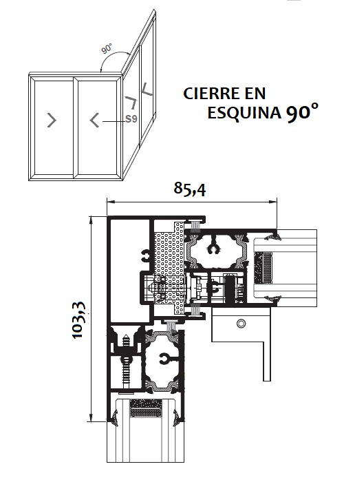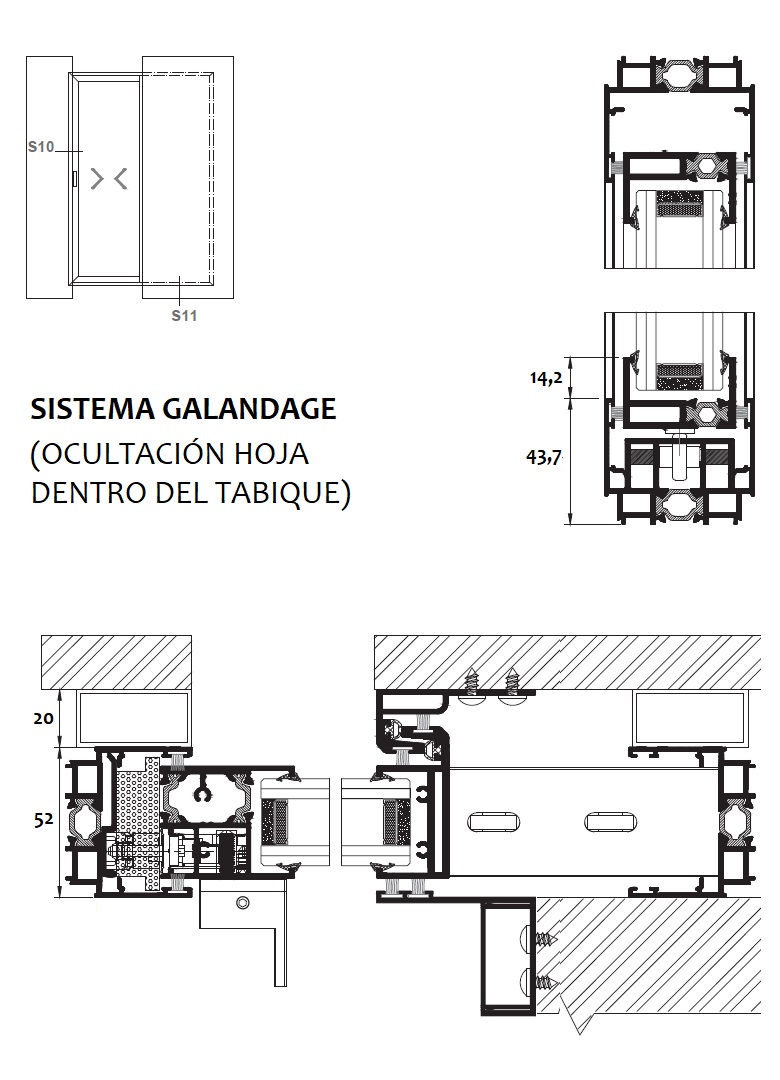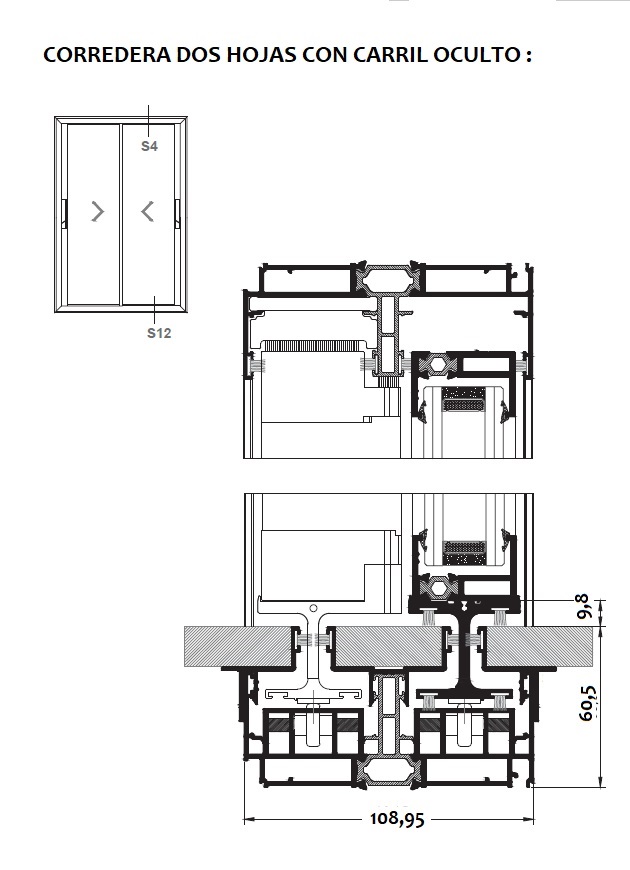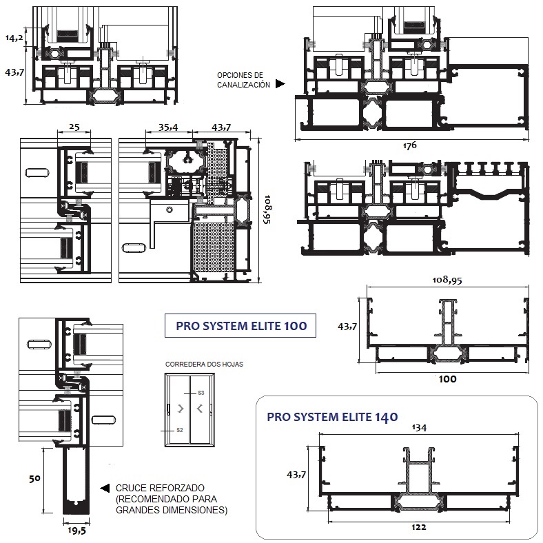 Visibilitat màxima gràcies a la secció vista ultra-reduïda de marc + full: 57,9 mm i encreuament de tan sols 25 mm. Infinitat de possibilitats d'instal·lació: amb/sense canalització (ver secciones), de tancament a cantonada, cerre "partició de blocs", carril totalment ocult i de motorització.