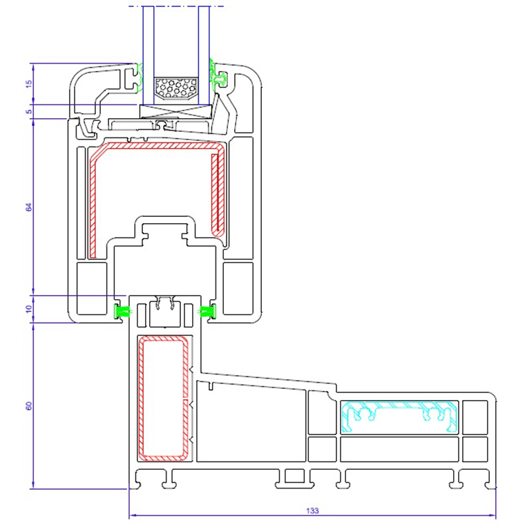• Perfils de PVC de 133 mm. amb sistema de doble junta i multicàmeres